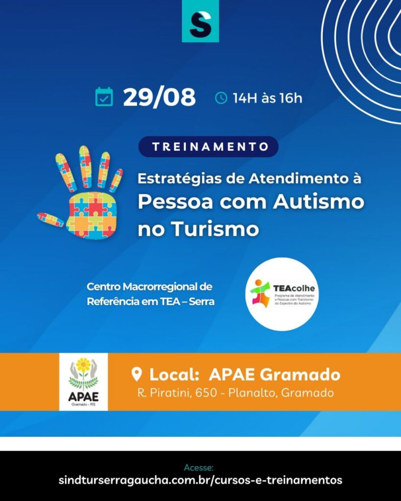 O Sindtur Serra Gaúcha em parceria com a APAE Gramado estará promovendo um treinamento que envolve estratégias de atendimento para pessoas com autismo no turismo. Trata-se de uma capacitação do Sindtur dentro do projeto TEAcolhe, um programa de atendimento a pessoas com transtorno do espectro do autismo. Esta ação do programa tem como objetivo contribuir com […]