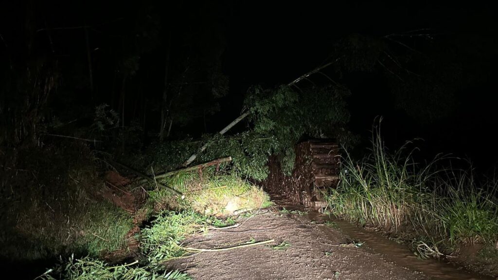 Estrada da Linha Marcondes, próxima à sociedade, está bloqueada devido ao deslizamento e queda de árvores