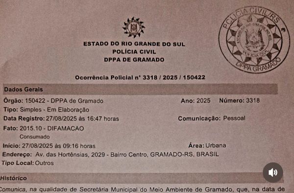 Cansada dos constantes ataques sofridos nas redes sociais e por aplicativos de mensagens, a Secretária de Meio Ambiente de Gramado, Cristiane Bandeira, registrou na Delegacia de Pronto Atendimento de Gramado (DPPA) nesta quarta-feira, dia 27, um boletim de ocorrência por difamação contra um ativista ambiental do município. O nome do suposto autor não será divulgado […]