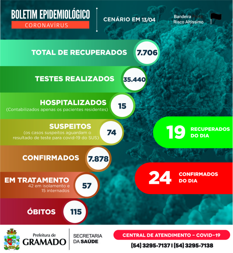 O Centro de Operações de Emergências (COE) Gramado, registrou nesta terça-feira (13), 24 novos casos e 19 recuperados do coronavírus (Covid-19). Ao todo, 57 pessoas estão em tratamento, sendo 15 hospitalizados e 42 em isolamento domiciliar. Desde o início da pandemia, Gramado realizou 35.440 testes nas redes pública e privada, confirmando 7.878 casos, dos quais 7.706 […]