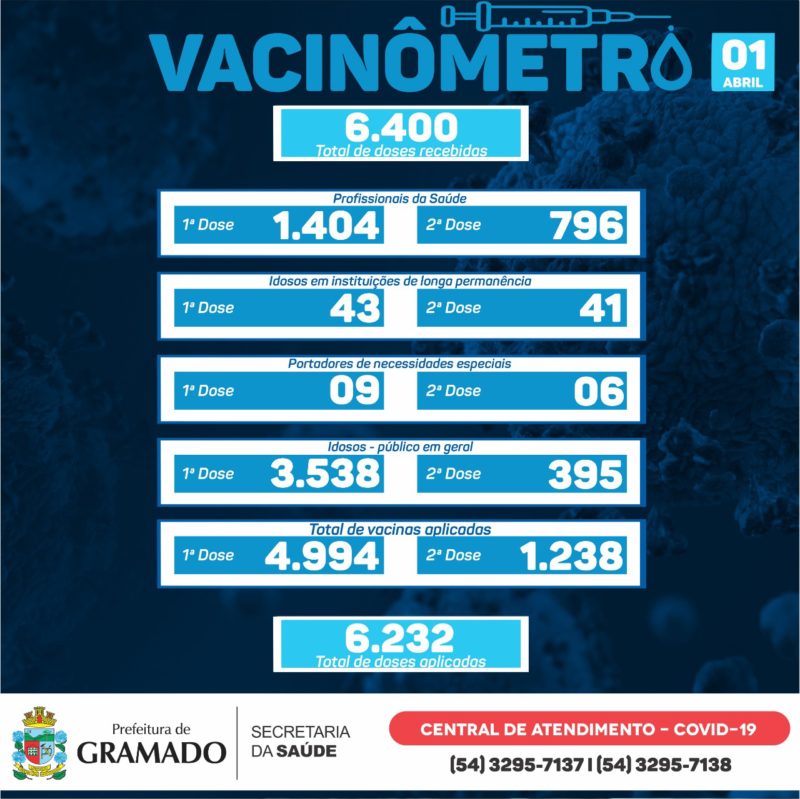 Em recente atualização do vacinômetro, a Prefeitura de Gramado, por meio da Secretaria de Saúde e Vigilância em Saúde, registrou, nesta quinta-feira (01), a aplicação de 6.232 doses da vacina contra o coronavírus (Covid-19). Ao todo, a cidade recebeu entre os dias 19 de janeiro e 23 de março, 6.400 doses do imunizante, entre a […]
