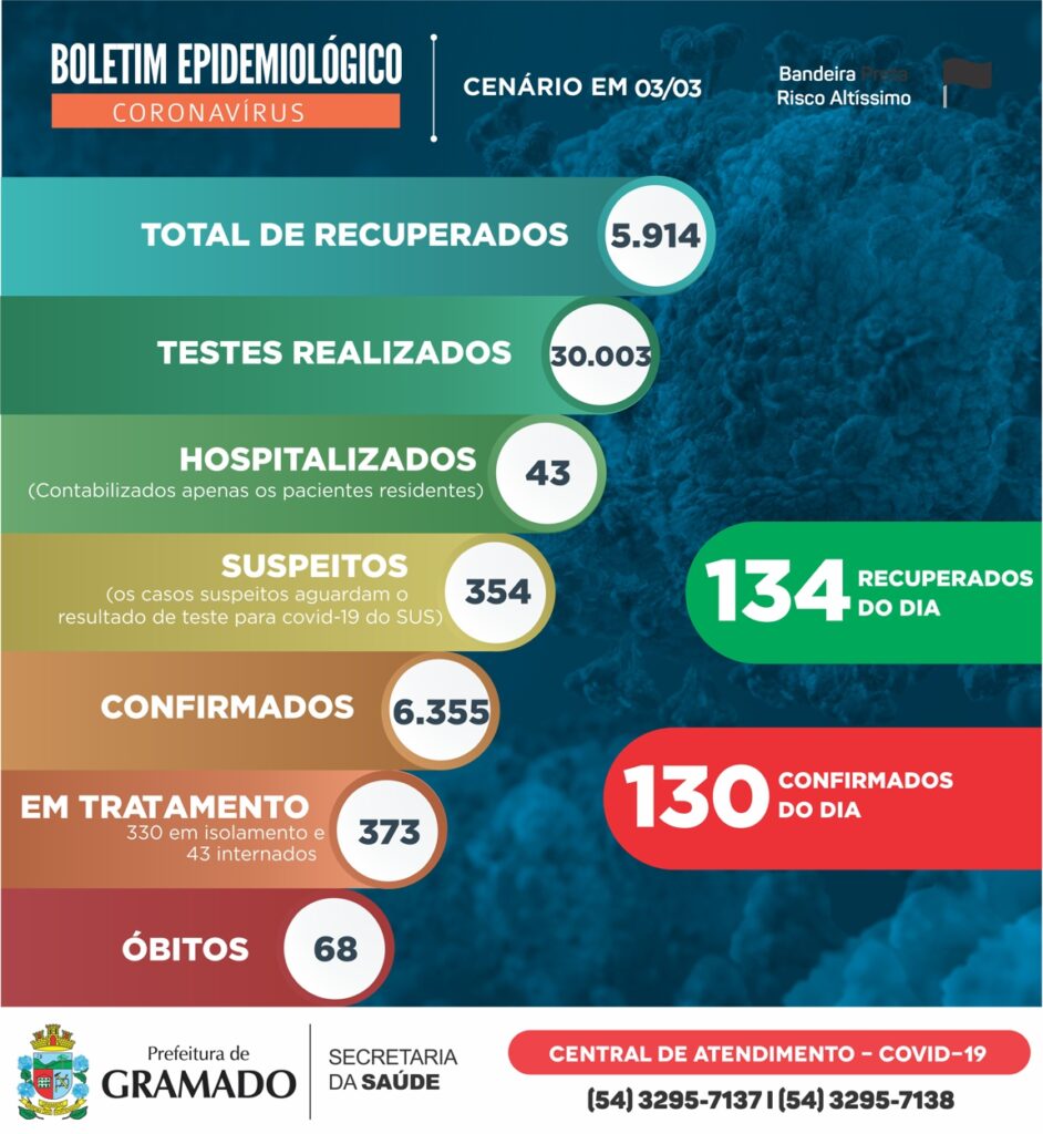 O boletim epidemiológico divulgado pela Prefeitura de Gramado, por meio do Centro de Operações de Emergência (COE) Gramado, nesta quarta-feira (03), registra 130 novos casos de coronavírus (Covid-19) e 134 gramadenses recuperados da doença. Ao todo, 373 pessoas estão em tratamento. A cidade atingiu 30 mil exames realizados desde o início da pandemia, destes 6.355 […]