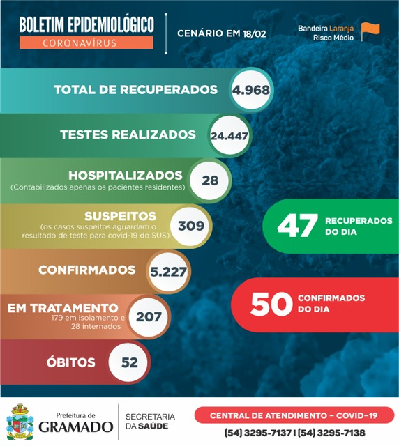 Gramado registra mais 50 novos casos e 47 recuperados da Covid-19