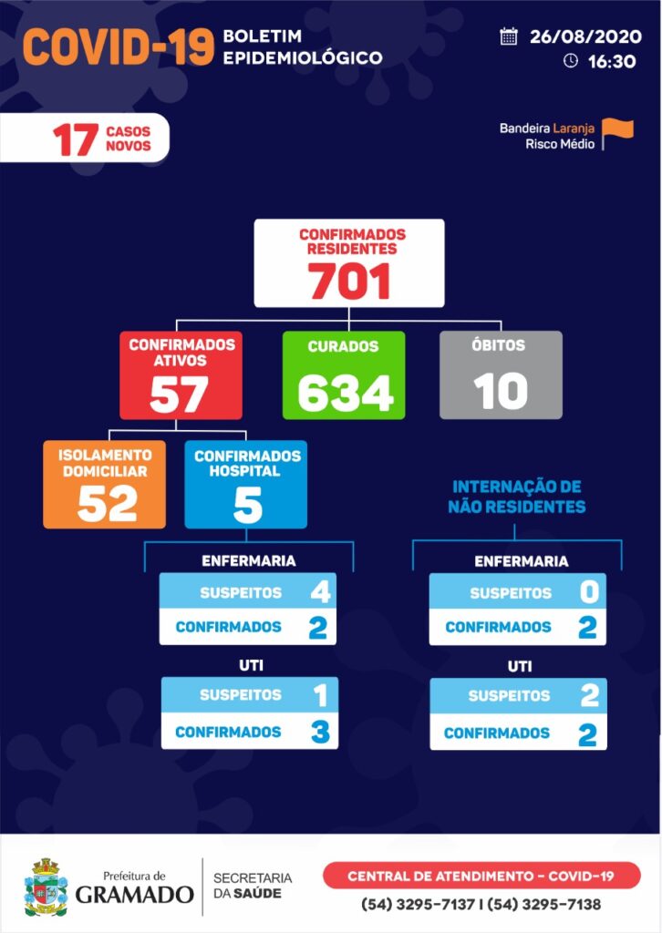 O boletim epidemiológico do Centro de Operações de Emergências (COE) de Gramado desta quarta-feira, dia 26, confirma 17 casos novos para Covid-19. Com isso, há 701 testagens positivas para residentes de Gramado. Deste total, 634 casos já estão recuperados e outros 52 moradores seguem em isolamento domiciliar. O Hospital Arcanjo São Miguel tem, atualmente, cinco moradores de […]