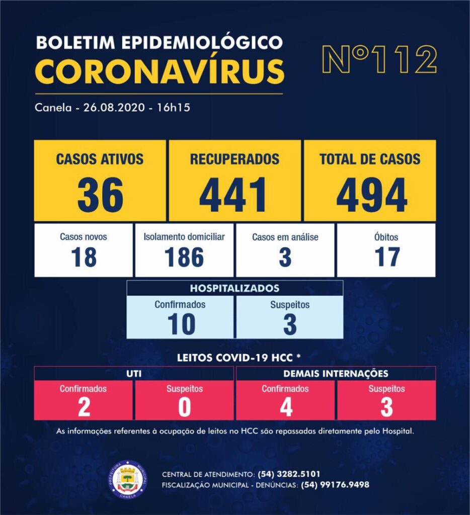 O Boletim emitido pelo COE Canela nas últimas 24 horas confirmou 18 exames que testaram positivo. Com isso Canela possui 36 casos ativos (infectados no momento) e registra 494 casos confirmados desde o início da pandemia. Atualmente são 13 pacientes de Canela que estão hospitalizados, sendo que 10 tiveram diagnóstico positivo para o coronavírus e […]